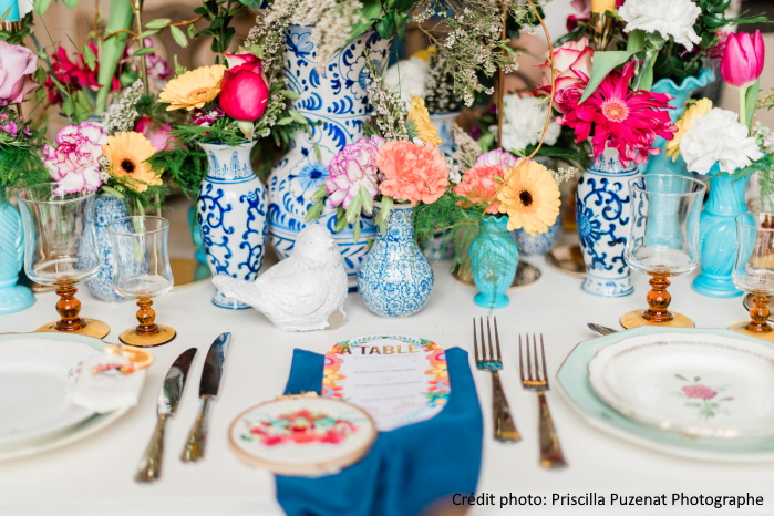 Location objets & mobiliers déco / Scénographie : "Chandeliers, vases colorés, fauteuils Emmanuelle... n'hésitez pas à consulter les sites de nos prestataires, vous y trouverez de belles inspirations pour décorer vos tables ou votre espace de cérémonie." Diane & François