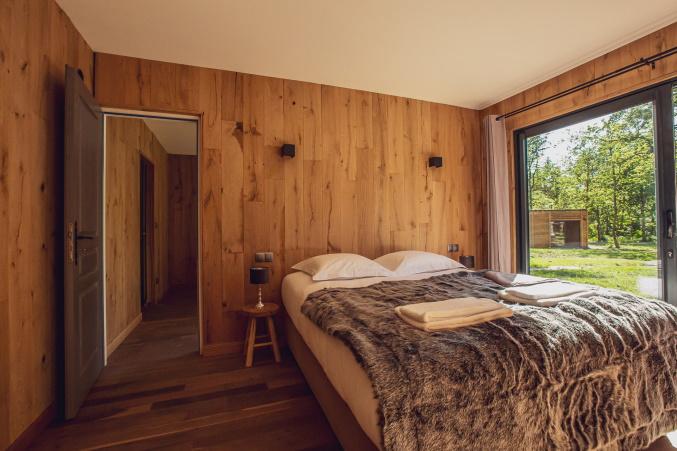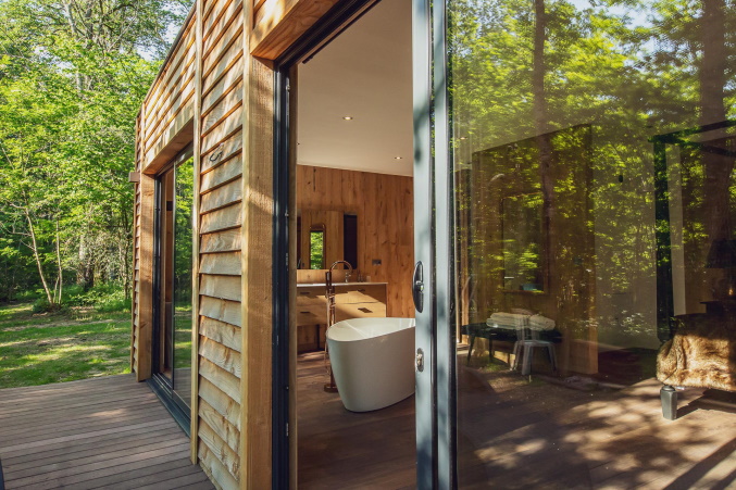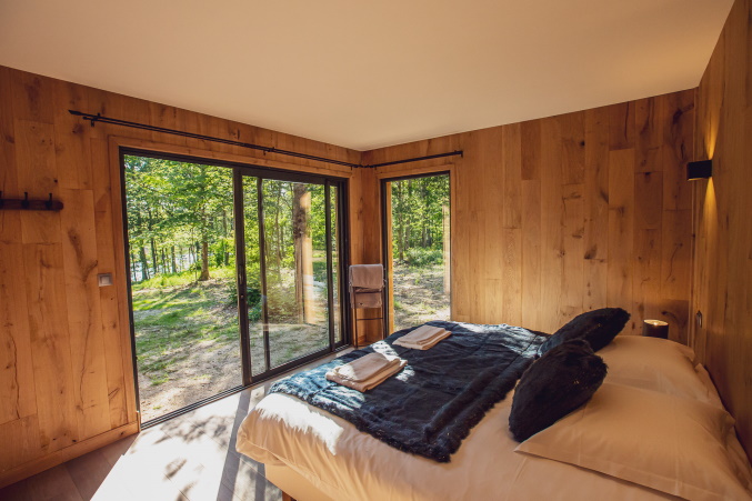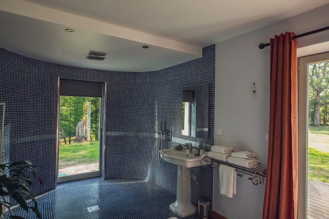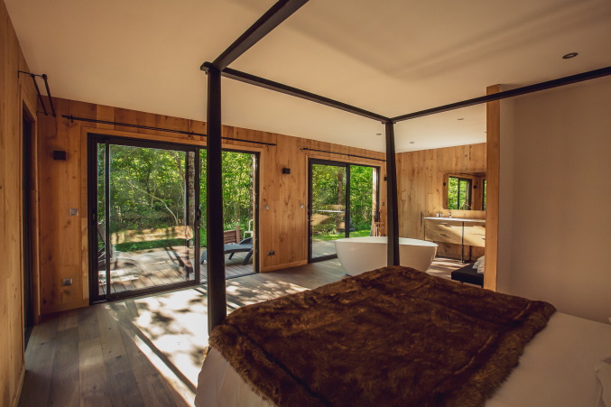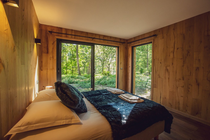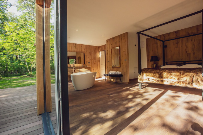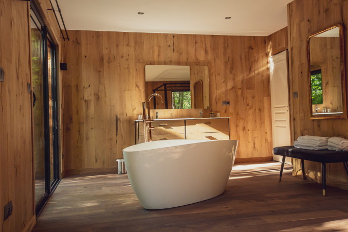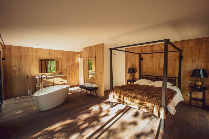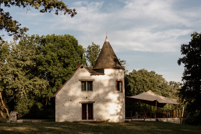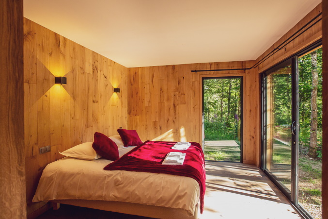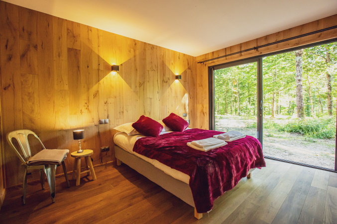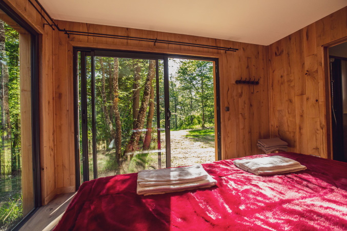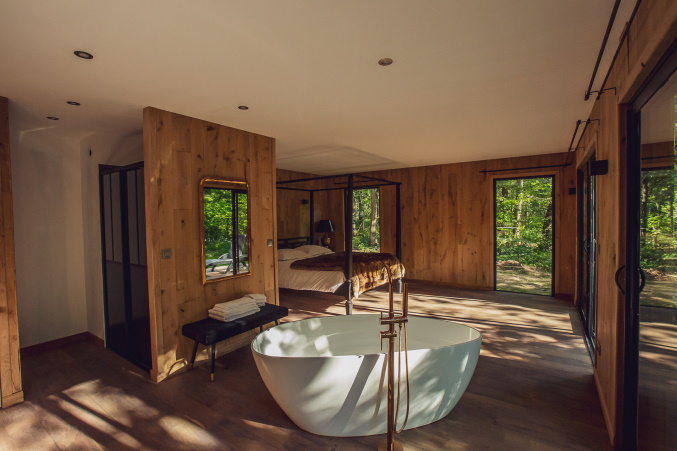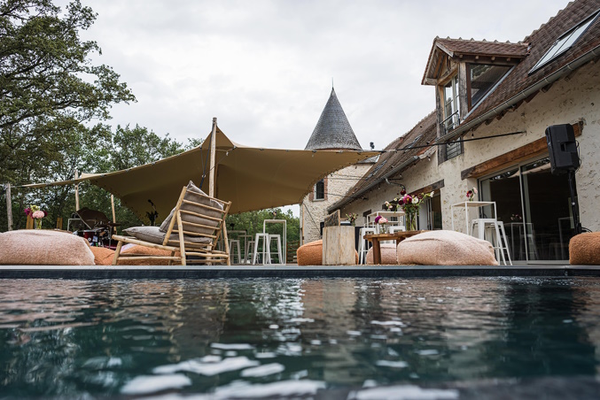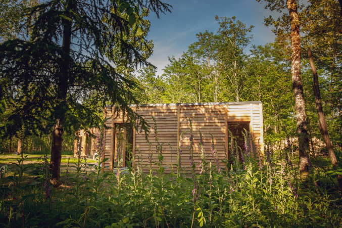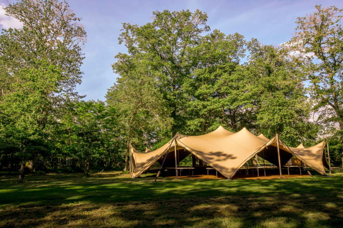 Un espace de cérémonie dans les arbres, une terrasse en escalier avec piscine à débordement et vue plongeante sur les étangs, une tente nomade octogonale entourée de grands chênes, un village de cabanes…